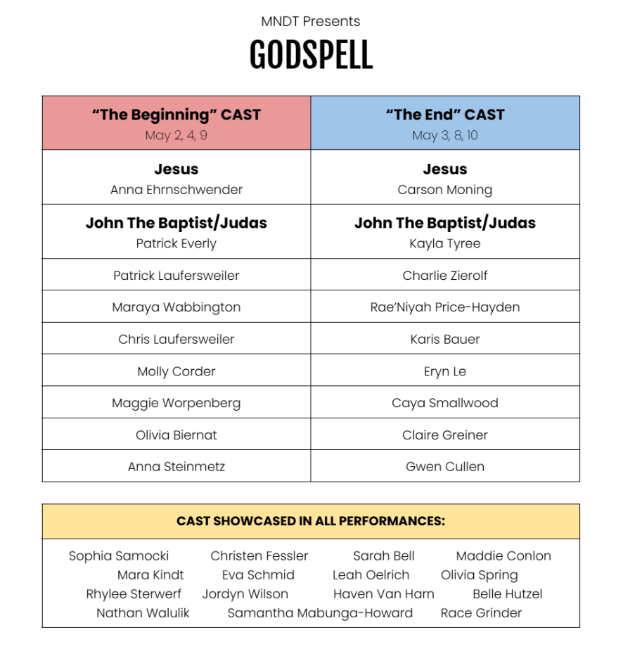 Godspell is a musical in two acts, including one fifteen minute intermission. The show is structured as a series of parables, primarily based on the Gospel of Matthew, interspersed with music mostly set to lyrics from traditional hymns. Act Two focuses on the betrayal and crucifixtion of Jesus.